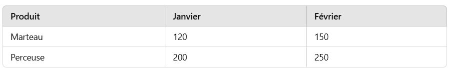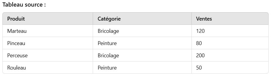 Exemple pratique : Vous avez des ventes (colonnes : Produit, Mois, Ventes) et vous voulez résumer les ventes par produit pour chaque mois.